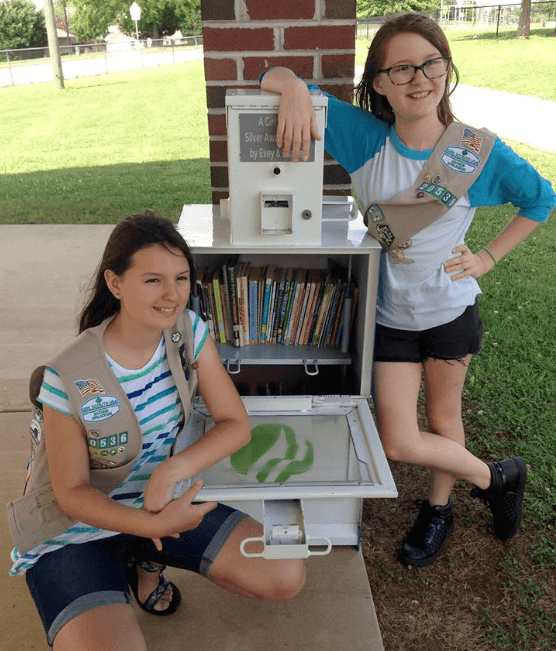 Girl Scouts of the Southern Appalachians kicked off National Library Week with Bridget and Evie, Silver Award Girl Scouts who worked together with their school to put a book box in their pavilion. They asked and were given permission from the Daily Times to use an old newspaper box. Smart thinking! With the goal of giving others easy reading access, it was decorated and filled with books.