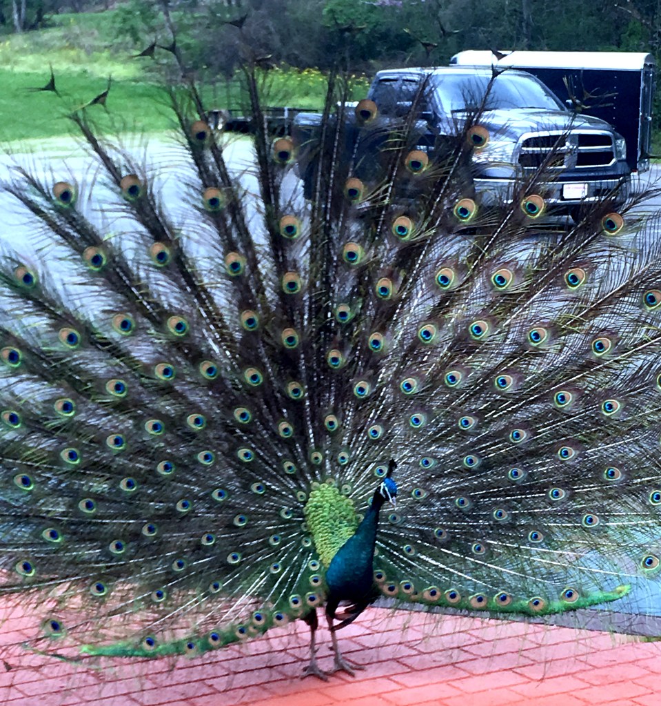 Every pet needs a name, and this peacock is no different. Kathy called him “Percy” after the aristocratic and flamboyant character of “Sir Percy Blakeney” in the 1982 movie The Scarlett Pimpernel. She felt that they had a lot in common.