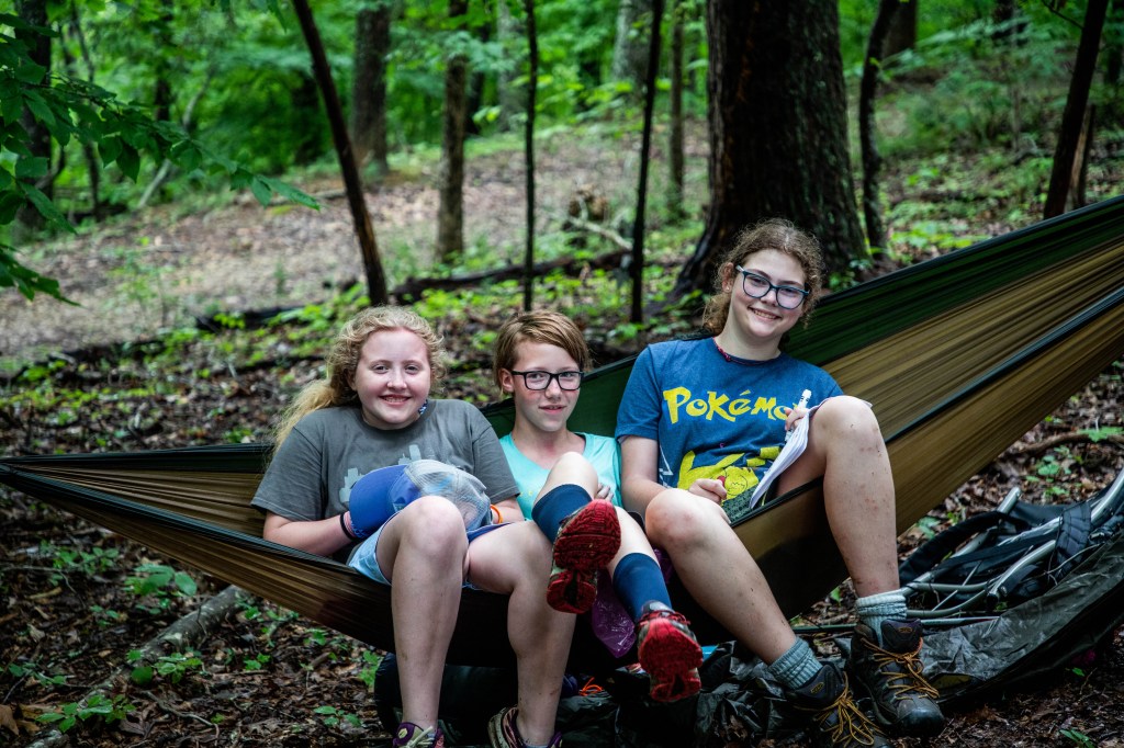 Another camper, Ava, says that she signed up for Wilderness Week for the chance to sleep in a hammock! She says, “At first I thought I wasn’t going to be able to fall asleep, but actually it’s really soothing and it really comfortable. You get to do a lot of activities, and you get to set up your own hammock. You make your own food, and it’s a lot of fun. And we’re on a mountain so we get to hike down it every day and hike back up.”