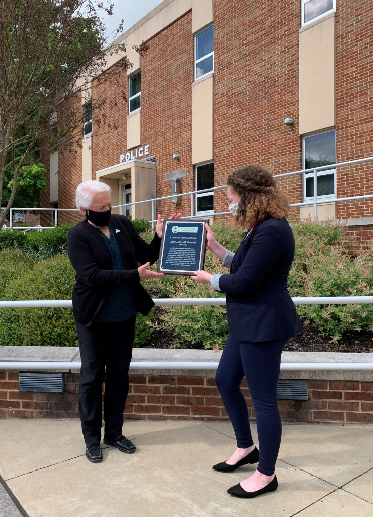 Presenting May McDowell plaque to Mayor Brock at Johnson City’s City Hall.