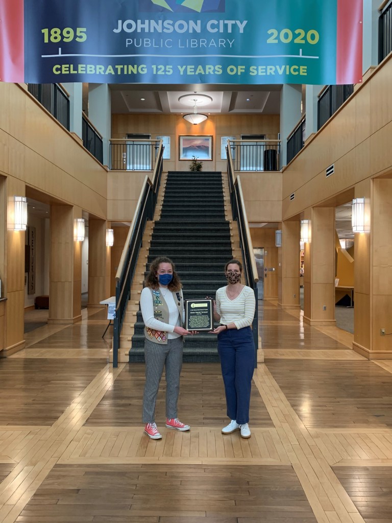 Presenting Gwen Terasaki plaque to Julia Turpin at the Johnson City Public Library.