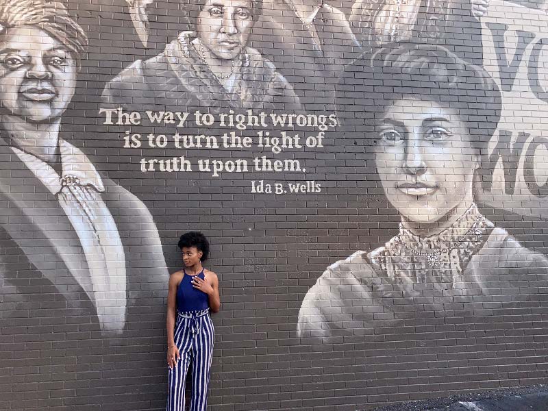 Jia is pictured here in front of a mural that reads: “The way to right wrongs is to turn the light of truth upon them.” – Ida B. Wells.
