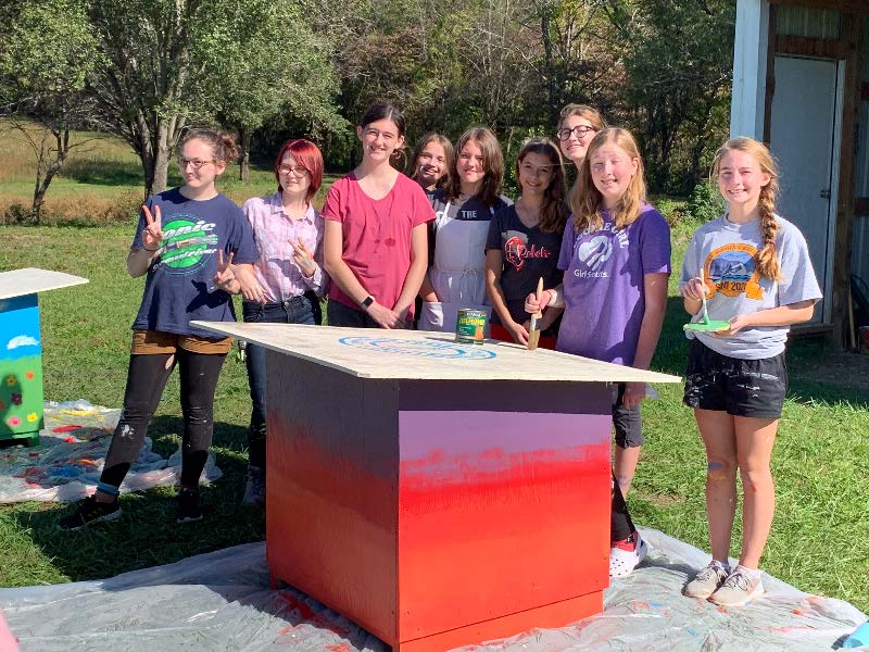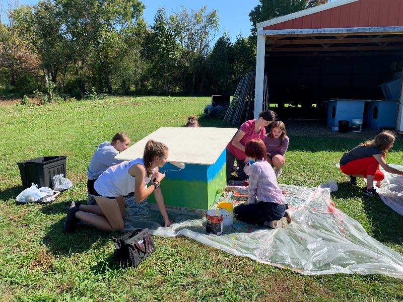 Maryn’s team of volunteers paint the newly-built doghouses.