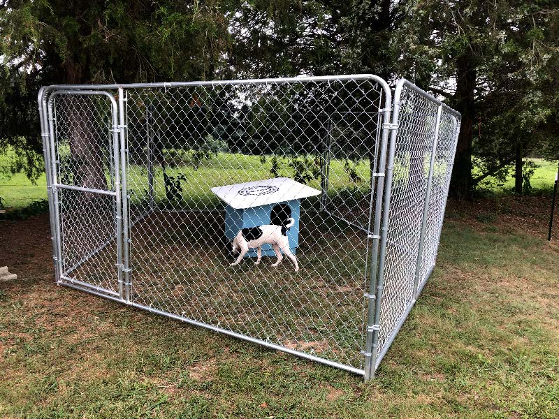 A happy recipient of a kennel and doghouse from Maryn’s project explores his new digs.