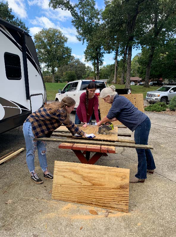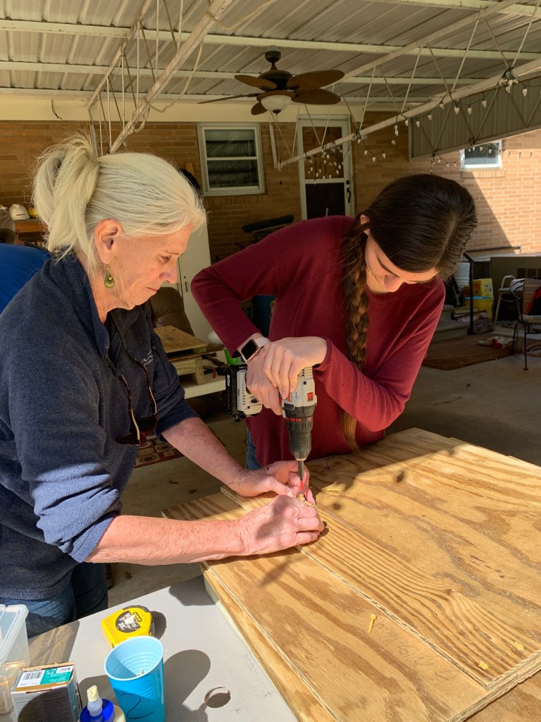 Maryn and her volunteers cut wood and assemble it into doghouses.