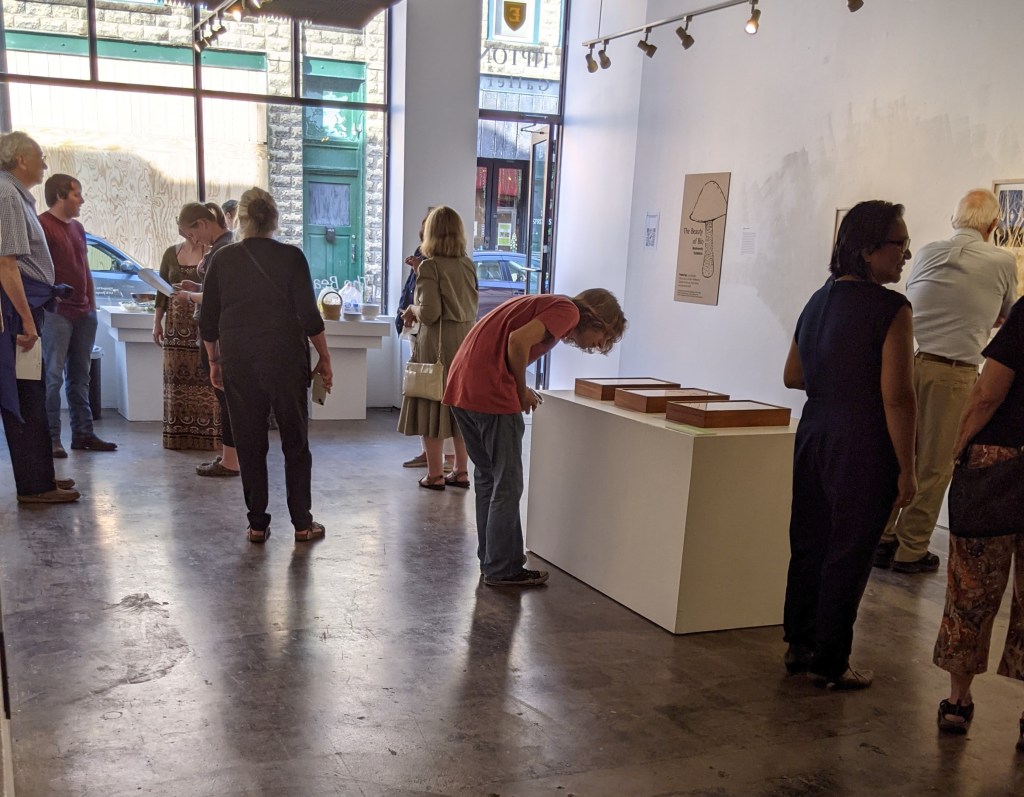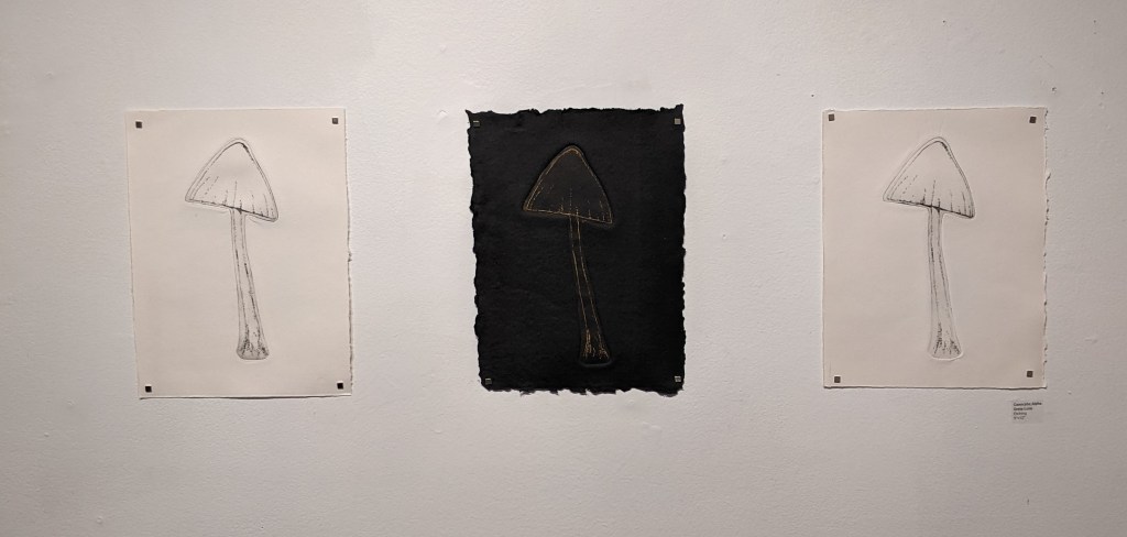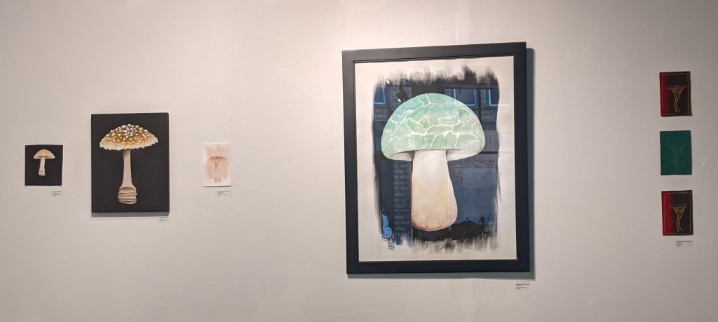 Many of the pieces in the show were by local artists showcasing a range of flora and fauna. One of the 3D pieces in the show was on loan from the Southern Lepidopterists’ Society and included butterflies, moths, and insects from all over the world. Greta’s own contributions were regional in nature, specifically focusing on mushrooms native to Appalachia.